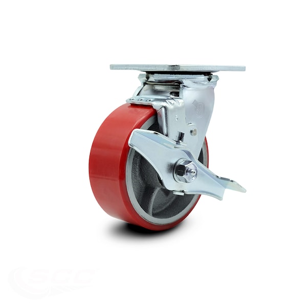 5 Inch Red Poly on Cast Iron Swivel Caster with Roller Bearing and Brake SCC