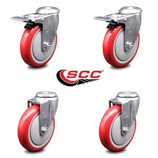 5 Inch Red Polyurethane Swivel Bolt Hole Caster Set with 2 Total Lock Brake