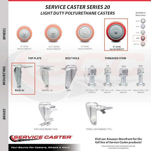 Listing is for one (1) Service Caster Series #20 rigid caster with a 5" diameter by 1-1/4" wide red polyurethane wheel capable of supporting 350lbs./caster. When searching for a reliable and durable solution to your caster needs, look no further than the Service Caster Series 20 top plate polyurethane casters. The Service Caster Series #20 is ideal for light and medium duty material handling, carts, equipment, and shop projects. The zinc plated finish provides durability under any condition, while the non-marking, non-marring polyurethane wheels perform especially well on hard surfaces such as concrete, tile, and wood- rolling on a finely crafted ball bearing design that keeps you moving forward. Service Caster is unsurpassed in quality, reliability, and excellent customer service. Count on us to move you forward.