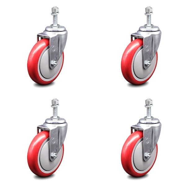 5 Inch Red Polyurethane Wheel Swivel 10mm Threaded Stem Caster Set SCC