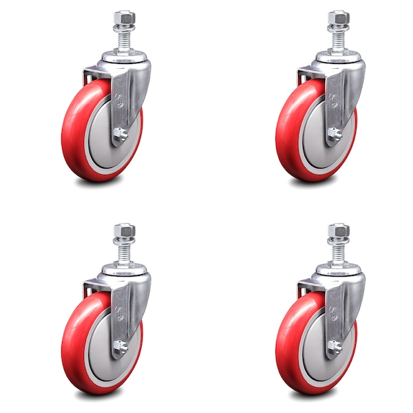 5 Inch Red Polyurethane Wheel Swivel 1/2 Inch Threaded Stem Caster Set SCC
