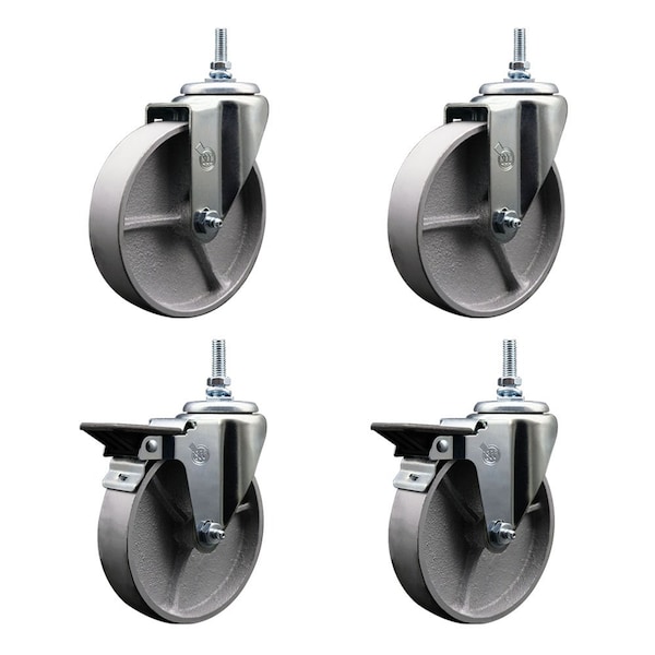 Listing is for a set of four 4 Service Caster Series 20 casters, two 2 swivel 12MM threaded stem with brake casters and two 2 swivel casters, with 5 diameter by 112 wide semi steel cast iron wheels Supports a total weight of 1,200lbs 300lbsper caster When searching for a reliable and durable solution to your caster needs, consider Service Casters Series 20 roller bearing semisteel cast iron casters The Service Caster Series 20 is ideal for light and medium duty material handling, carts, equipment, and shop projects The zinc plated finish provides durability under any condition, while the semisteel wheels are abrasion resistant and rugged, maintaining effortless rolling under heavier loads, and provides a costeffective solution over steel wheels The roller bearing is capable of carrying greater loads while also providing smoother rolling motion It has a split outer race shell into which the roller assembly is inserted Combination sealthrust retainer washers protect the bearing from dirt, water, and chemicals They also help absorb thrust friction Note roller bearing must be used with hardened spanner bushing or hardened shaft Mounting options include top plate, bolt hole and standard and metric threaded stem sizes