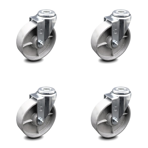 Listing is for a set of four (4) Service Caster Series #20 casters, four (4) swivel bolt hole casters with 5” diameter by 1-1/2” wide semi steel cast iron wheels. Supports a total weight of 1,200lbs (300lbs/per caster). When searching for a reliable and durable solution to your caster needs, consider Service Caster’s Series 20 roller bearing semi-steel cast iron casters. The Service Caster Series #20 is ideal for light and medium duty material handling, carts, equipment, and shop projects. The zinc plated finish provides durability under any condition, while the semi-steel wheels are abrasion resistant and rugged, maintaining effortless rolling under heavier loads, and provides a cost-effective solution over steel wheels. The roller bearing is capable of carrying greater loads while also providing smoother rolling motion. It has a split outer race shell into which the roller assembly is inserted. Combination seal/thrust retainer washers protect the bearing from dirt, water, and chemicals. They also help absorb thrust friction (Note: roller bearing must be used with hardened spanner bushing or hardened shaft). Mounting options include top plate, bolt hole and standard and metric threaded stem sizes. Service Caster is unsurpassed in quality, reliability, and excellent customer service. Count on us to move you forward.