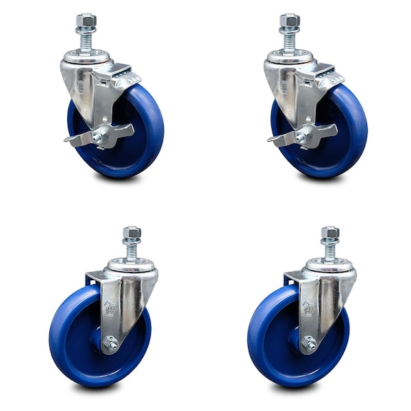 Listing is for a set of four (4) Service Caster Series #20 casters, two (2) swivel 1/2" threaded stem with brake casters and two (2) swivel casters, with 5” diameter by 1-1/4” wide solid polyurethane wheels. Supports a total weight of 1,200lbs (300lbs/per caster).The Service Caster Series #20 is ideal for light and medium duty material handling, carts, equipment, and shop projects. The zinc plated finish provides durability under any condition. And the non-marking, non-marring polyurethane wheel is molded as one solid piece, making it free from debonding. This ensures the wheel will not flat spot, as can occur with comparable polyurethane wheels, resulting in a smooth and solid roll over long periods of time. Mounting options include top plate, bolt hole and standard and metric threaded stem sizes. Service Caster is unsurpassed in quality, reliability, and excellent customer service. Count on us to move you forward.