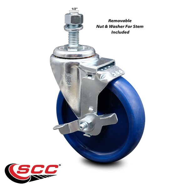5 Inch Solid Polyurethane Wheel Swivel 1/2 Inch Threaded Stem Caster with Brake