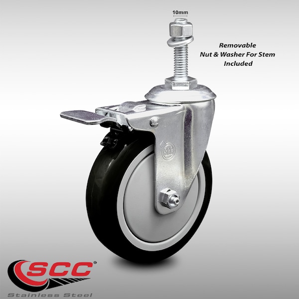 5 Inch SS Black Polyurethane 10mm Threaded Stem Caster with Total Lock Brake
