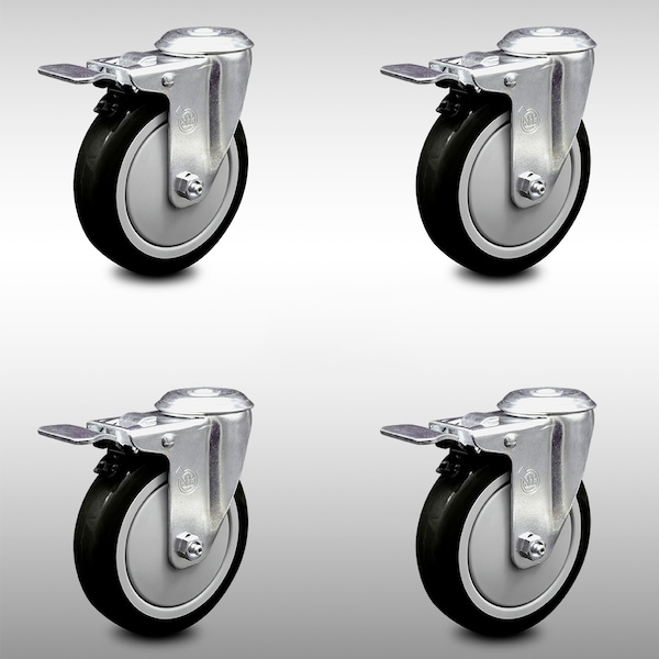 5 Inch SS Black Polyurethane Swivel Bolt Hole Caster Set with Total Lock Brake