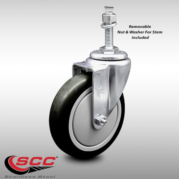 5 Inch SS Black Polyurethane Wheel Swivel 10mm Threaded Stem Caster SCC