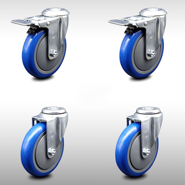 5 Inch SS Blue Polyurethane Swivel Bolt Hole Caster Set with 2 Total Lock Brake