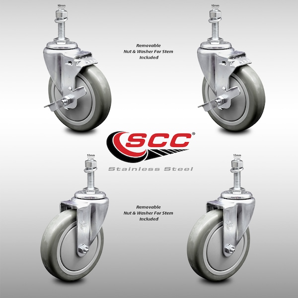 5 Inch SS Gray Polyurethane Swivel 10mm Threaded Stem Caster Brake SCC, 2PK