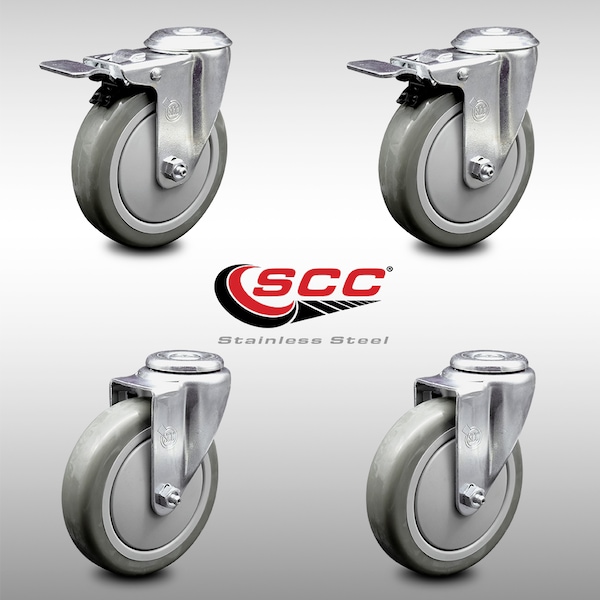 5 Inch SS Gray Polyurethane Swivel Bolt Hole Caster Set with 2 Total Lock Brake