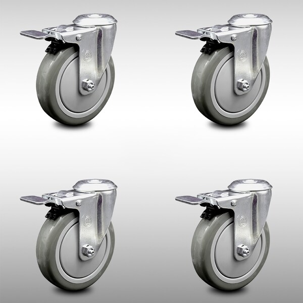 5 Inch SS Gray Polyurethane Swivel Bolt Hole Caster Set with Total Lock Brake