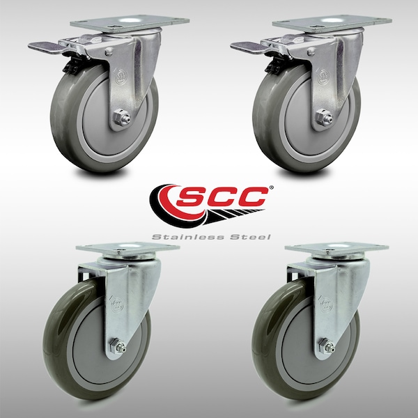 5 Inch SS Gray Polyurethane Top Plate Caster Total Lock Brakes SCC, 2PK