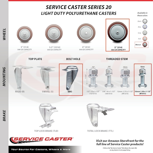 Listing is for a set of four (4) Service Caster Series #20 stainless steel casters, two (2) swivel 10mm-1.50 X 1-1/2" metric threaded stem with total lock brake casters and two (2) swivel casters, with 5” diameter by 1-1/4” wide maroon polyurethane wheels. Supports a total weight of 1,200lbs (300lbs/per caster).When searching for a reliable and durable solution to your caster needs, consider Service Caster’s Series 20 stainless steel threaded stem polyurethane casters. The Service Caster Series #20 is ideal for light and medium duty material handling, carts, equipment, and shop projects. The threaded stem is available in standard or metric sizes and ensures a solid and secure attachment. The polished stainless steel finish provides durability under any condition, while the non-marking, non-marring polyurethane wheels perform especially well on hard surfaces such as concrete, tile, and wood. All rolling via a finely crafted ball bearing design that will keep you moving forward. Service Caster is unsurpassed in quality, reliability, and excellent customer service. Count on us to move you forward.