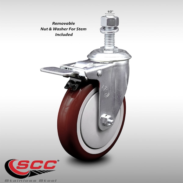 5 Inch SS Maroon Polyurethane 1/2 Inch Threaded Stem Caster with Total Lock Brake