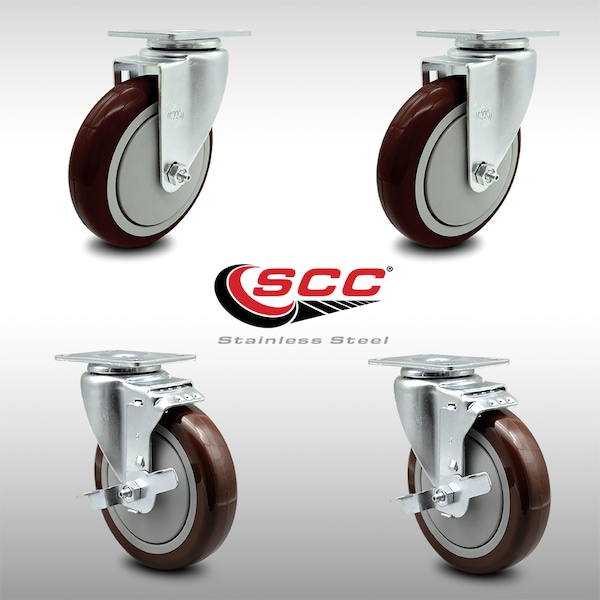 5 Inch SS Maroon Polyurethane Swivel Top Plate Caster Set with 2 Brakes SCC