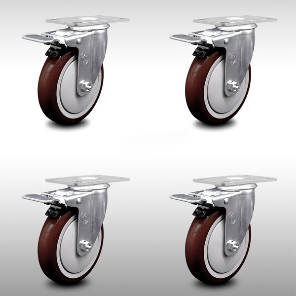 5 Inch SS Maroon Polyurethane Top Plate Caster Set Total Lock Brake SCC