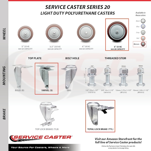 Listing is for a set of four (4) Service Caster Series #20 stainless steel casters, two (2) swivel total lock brake casters and two (2) swivel casters, with 5” diameter by 1-1/4” wide maroon polyurethane wheels. Supports a total weight of 1,200lbs (300lbs/per caster).When searching for a reliable and durable solution to your caster needs, consider Service Caster’s Series 20 stainless steel threaded stem polyurethane casters. The Service Caster Series #20 is ideal for light and medium duty material handling, carts, equipment, and shop projects. The threaded stem is available in standard or metric sizes and ensures a solid and secure attachment. The polished stainless steel finish provides durability under any condition, while the non-marking, non-marring polyurethane wheels perform especially well on hard surfaces such as concrete, tile, and wood. All rolling via a finely crafted ball bearing design that will keep you moving forward. Service Caster is unsurpassed in quality, reliability, and excellent customer service. Count on us to move you forward.
