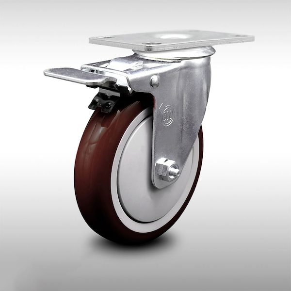 Listing is for one (1) Service Caster Series #20 stainless steel swivel caster with a 5" diameter by 1-1/4" wide maroon polyurethane wheel and a total lock brake capable of supporting 300lbs./caster.When searching for a reliable and durable solution to your caster needs, look no further than the Service Caster Series 20 top plate stainless steel casters. The Service Caster Series #20 is ideal for light and medium duty material handling, carts, equipment, and shop projects. The luxuriously polished stainless steel finish resists rust and corrosion in indoor or outdoor applications where moisture is a factor, while the non-marking, non-marring polyurethane wheels perform especially well on hard surfaces such as concrete, tile, and wood- rolling on a finely crafted ball bearing design that keeps you moving forward. Service Caster is unsurpassed in quality, reliability, and excellent customer service. Count on us to move you forward.