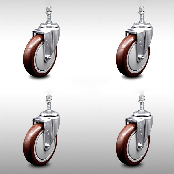 5 Inch SS Maroon Polyurethane Wheel Swivel 10mm Threaded Stem Caster Set SCC