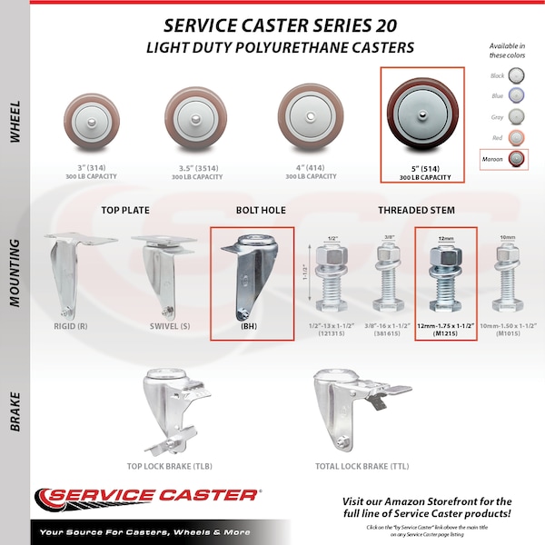 Listing is for a set of four (4) Service Caster Series #20 stainless steel swivel casters, four (4) swivel 12mm threaded stem casters with 5” diameter by 1-1/4” wide maroon polyurethane wheels. Supports a total weight of 1,200lbs (300lbs/per caster). When searching for a reliable and durable solution to your caster needs, consider Service Caster’s Series 20 stainless steel threaded stem polyurethane casters. The Service Caster Series #20 is ideal for light and medium duty material handling, carts, equipment, and shop projects. The threaded stem is available in standard or metric sizes and ensures a solid and secure attachment. The polished stainless steel finish provides durability under any condition, while the non-marking, non-marring polyurethane wheels perform especially well on hard surfaces such as concrete, tile, and wood. All rolling via a finely crafted ball bearing design that will keep you moving forward. Service Caster is unsurpassed in quality, reliability, and excellent customer service. Count on us to move you forward.