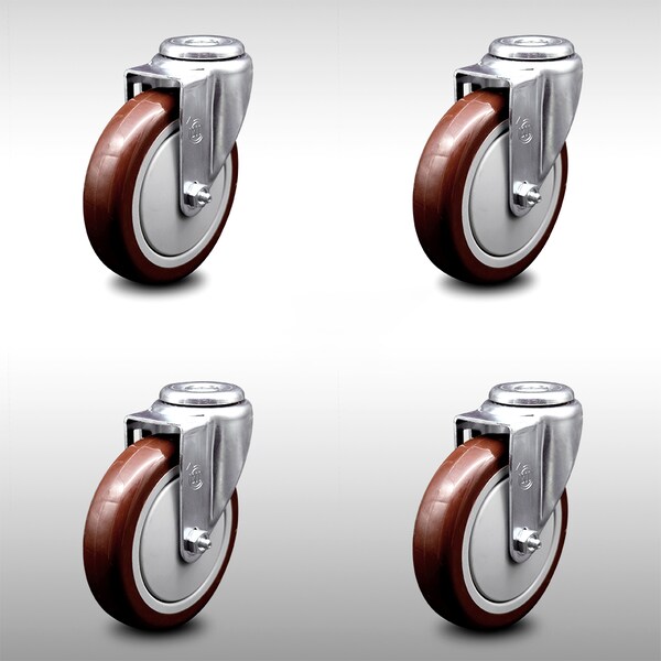 5 Inch SS Maroon Polyurethane Wheel Swivel Bolt Hole Caster Set