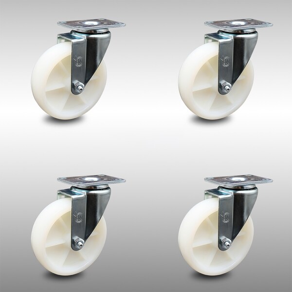 Listing is for a set of four (4) Service Caster Series #20 stainless steel swivel casters, four (4) swivel casters with 5” diameter by 1-1/4” wide nylon wheels. Supports a total weight of 1,200lbs (300lbs/per caster). When searching for a reliable and durable solution to your caster needs, consider Service Caster Series 20 top plate nylon wheel casters. The Service Caster Series #20 is ideal for light and medium duty material handling, carts, equipment, and shop projects. The zinc plated finish provides durability under any condition, and the nylon wheels provide very low rolling resistance, show a high resistance to many aggressive substances, and are maintenance free under normal operating conditions. Not only are they resistant to most chemicals and oils, but they will be sure to keep you safely moving forward. Service Caster is unsurpassed in quality, reliability, and excellent customer service. Count on us to move you forward.