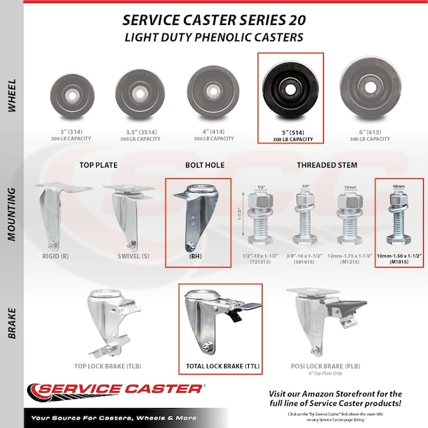 Listing is for one (1) Service Caster Series #20 stainless steel swivel caster with a 5" diameter by 1-1/4" wide phenolic wheel and a 10mm-1.50 X 1-1/2" metric threaded stem with total lock brake capable of supporting 300 lbs./caster.When searching for a reliable and durable solution to your caster needs, consider Service Caster’s Series 20 phenolic casters. The Service Caster Series #20 is ideal for light and medium duty material handling, carts, equipment, and shop projects. The phenolic wheels have a high resistance to impact damage while providing protection for floors in commercial and industrial settings. Phenolic wheels not only provide higher load capacities and impact resistance than comparable wheels, but are also resistant to most chemicals and oils. Mounting options include top plate, bolt hole and standard and metric threaded stem sizes. All rolling on a finely crafted ball bearing design and zinc plated finish that provides durability under any condition and keeps you safely moving forward. Service Caster is unsurpassed in quality, reliability, and excellent customer service. Count on us to move you forward.
