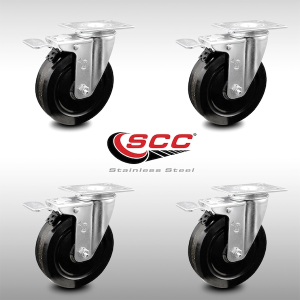5 Inch SS Phenolic Top Plate Caster Set Total Lock Brake