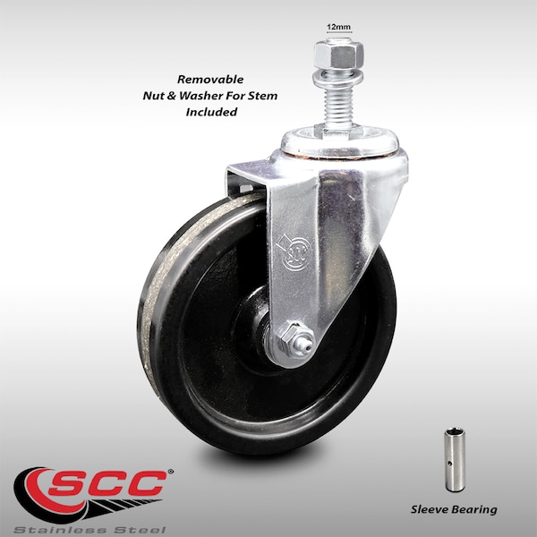 5 Inch SS Phenolic Wheel Swivel 12mm Threaded Stem Caster