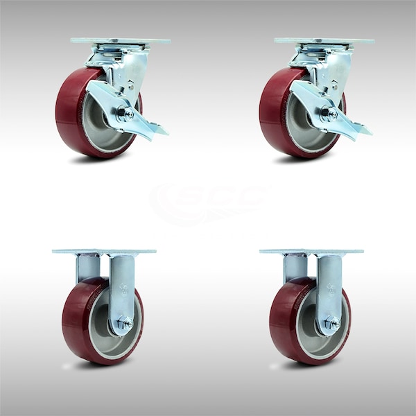 Listing is for a set of four (4) Service Caster Series #30 stainless steel casters, two (2) swivel casters with side lock brakes and two (2) rigid casters, with 5" diameter by 2" wide polyurethane on aluminum wheels capable of supporting a total weight of 3,600 lbs. (900 lbs./caster).When searching for a reliable and durable solution to your caster needs, rely on Service Caster Series 30 stainless steel polyurethane aluminum casters. The Series #30 features heavy duty polyurethane wheels that are chemically bonded to an aluminum core, providing a smooth roll over uneven surfaces without marking or marring floors. Finely crafted with a heat-treated ball bearing raceway, these versatile casters are ideal for a wide range of applications. Use on dollies, platform trucks, warehouse carts and freight terminals, or ensure a smooth and secure ride for food service carts, hotel housekeeping carts, and industrial and commercial equipment. In contrast to the zinc plated caster, the luxuriously polished stainless steel finish resists rust and corrosion in indoor or outdoor applications where moisture is a factor. Service Caster is unsurpassed in quality, reliability, and excellent customer service. Count on us to move you forward.