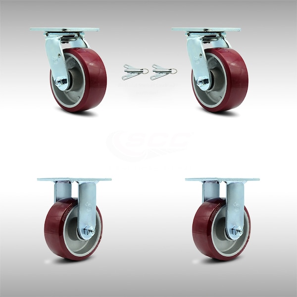 Listing is for a set of four (4) Service Caster Series #30 stainless steel casters, two (2) swivel casters with bolt on swivel locks and two (2) rigid casters, with 5" diameter by 2" wide polyurethane on aluminum wheels capable of supporting a total weight of 3,600 lbs. (900 lbs./caster).When searching for a reliable and durable solution to your caster needs, rely on Service Caster Series 30 stainless steel polyurethane aluminum casters. The Series #30 features heavy duty polyurethane wheels that are chemically bonded to an aluminum core, providing a smooth roll over uneven surfaces without marking or marring floors. Finely crafted with a heat-treated ball bearing raceway, these versatile casters are ideal for a wide range of applications. Use on dollies, platform trucks, warehouse carts and freight terminals, or ensure a smooth and secure ride for food service carts, hotel housekeeping carts, and industrial and commercial equipment. In contrast to the zinc plated caster, the luxuriously polished stainless steel finish resists rust and corrosion in indoor or outdoor applications where moisture is a factor. Service Caster is unsurpassed in quality, reliability, and excellent customer service. Count on us to move you forward.