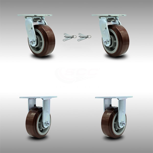 5 Inch SS Polyurethane Caster Set with Roller Bearings 2 Swivel Lock 2 Rigid SCC
