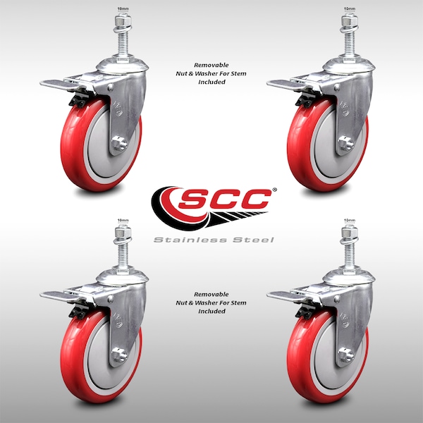 5 Inch SS Red Polyurethane 10mm Threaded Stem Caster Set Total Lock Brake