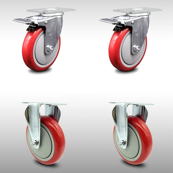 5 Inch SS Red Polyurethane Top Plate Caster Lock Brake 2 Rigid SCC, 2PK