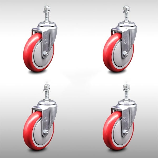 5 Inch SS Red Polyurethane Wheel Swivel 10mm Threaded Stem Caster Set SCC