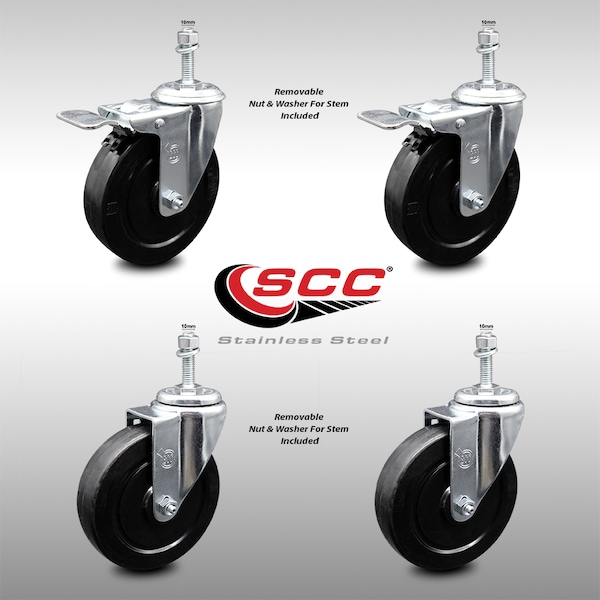5 Inch SS Soft Rubber 10mm Threaded Stem Caster Total Lock Brake SCC, 2PK