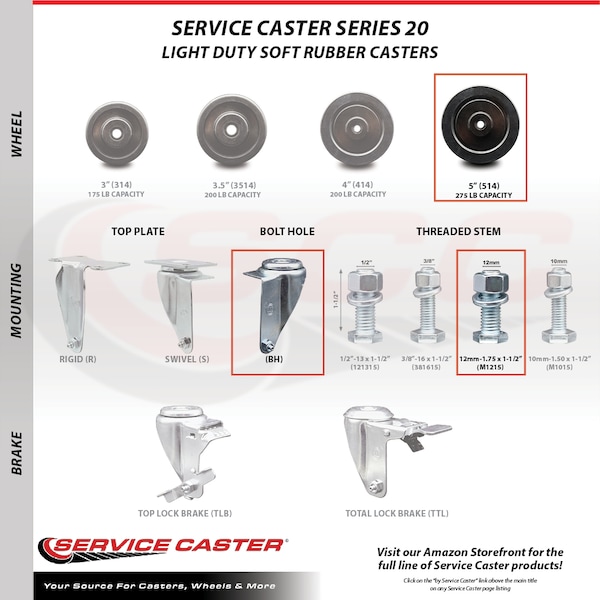 Listing is for a set of four (4) Service Caster Series #20 stainless steel casters, two (2) swivel 12mm-1.75 X 1-1/2" metric threaded stem with total lock brake casters and two (2) swivel casters, with 5” diameter by 1-1/4” wide soft rubber wheels. Supports a total weight of 1,100lbs (275lbs/per caster).When searching for a reliable and durable solution to your caster needs, consider Service Caster’s Series 20 stainless steel soft rubber casters. The Service Caster Series #20 is ideal for light and medium duty material handling, carts, equipment, and shop projects. The soft rubber wheels- resistant to most chemicals and oils- combine a soft tread on a hard rubber core, offering quiet movement and a cushioned ride. In contrast to the zinc plated caster, the luxuriously polished stainless steel finish resists rust and corrosion in indoor or outdoor applications where moisture is a factor. Mounting options include top plate, bolt hole and standard and metric threaded stem sizes. Service Caster is unsurpassed in quality, reliability, and excellent customer service. Count on us to move you forward.