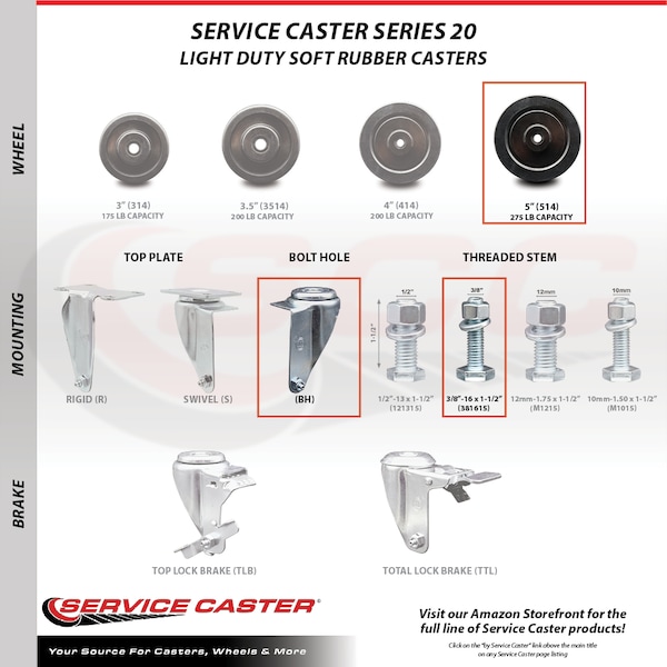 Listing is for one (1) Service Caster Series #20 stainless steel swivel caster with a 5" diameter by 1-1/4" wide soft rubber wheel and a 3/8" threaded stem capable of supporting 275 lbs./caster.When searching for a reliable and durable solution to your caster needs, consider Service Caster’s Series 20 stainless steel soft rubber casters. The Service Caster Series #20 is ideal for light and medium duty material handling, carts, equipment, and shop projects. The soft rubber wheels- resistant to most chemicals and oils- combine a soft tread on a hard rubber core, offering quiet movement and a cushioned ride. In contrast to the zinc plated caster, the luxuriously polished stainless steel finish resists rust and corrosion in indoor or outdoor applications where moisture is a factor. Mounting options include top plate, bolt hole and standard and metric threaded stem sizes. Service Caster is unsurpassed in quality, reliability, and excellent customer service. Count on us to move you forward.