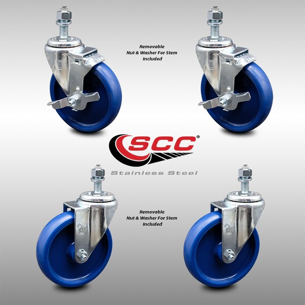 5 Inch SS Solid Polyurethane Swivel 1/2 Inch Threaded Stem Caster Brakes SCC, 2PK