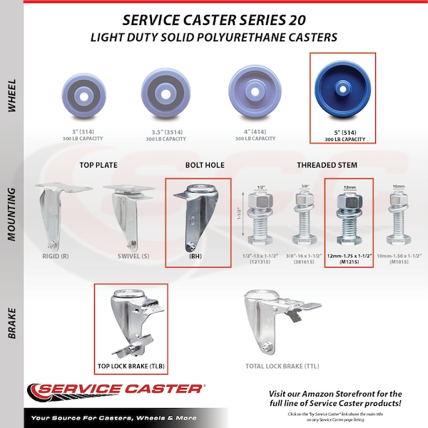 Listing is for one (1) Service Caster Series #20 stainless steel swivel caster with a 5" diameter by 1-1/4" wide solid polyurethane wheel and a 12mm-1.75 X 1-1/2" metric threaded stem with brake capable of supporting 300 lbs./caster.The Service Caster Series #20 is ideal for light and medium duty material handling, carts, equipment, and shop projects. The zinc plated finish provides durability under any condition. And the non-marking, non-marring polyurethane wheel is molded as one solid piece, making it free from debonding. This ensures the wheel will not flat spot, as can occur with comparable polyurethane wheels, resulting in a smooth and solid roll over long periods of time. Mounting options include top plate, bolt hole and standard and metric threaded stem sizes. Service Caster is unsurpassed in quality, reliability, and excellent customer service. Count on us to move you forward.