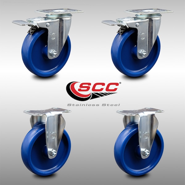 5 Inch SS Solid Polyurethane Top Plate Caster Lock Brake 2 Rigid SCC, 2PK