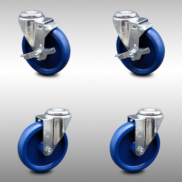 Listing is for a set of four (4) Service Caster Series #20 stainless steel casters, two (2) swivel bolt hole casters and two (2) swivel casters with top lock brakes, with 5” diameter by 1-1/4” wide solid polyurethane wheels. Supports a total weight of 1,200lbs (300lbs/per caster).The Service Caster Series #20 is ideal for light and medium duty material handling, carts, equipment, and shop projects. The zinc plated finish provides durability under any condition. And the non-marking, non-marring polyurethane wheel is molded as one solid piece, making it free from debonding. This ensures the wheel will not flat spot, as can occur with comparable polyurethane wheels, resulting in a smooth and solid roll over long periods of time. Mounting options include top plate, bolt hole and standard and metric threaded stem sizes. Service Caster is unsurpassed in quality, reliability, and excellent customer service. Count on us to move you forward.