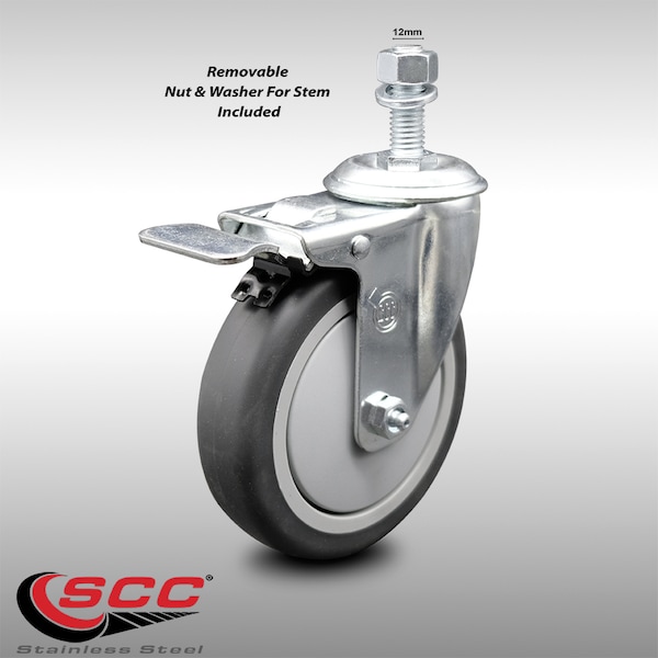 5 Inch SS Thermoplastic Rubber 12mm Threaded Stem Caster Total Lock Brake