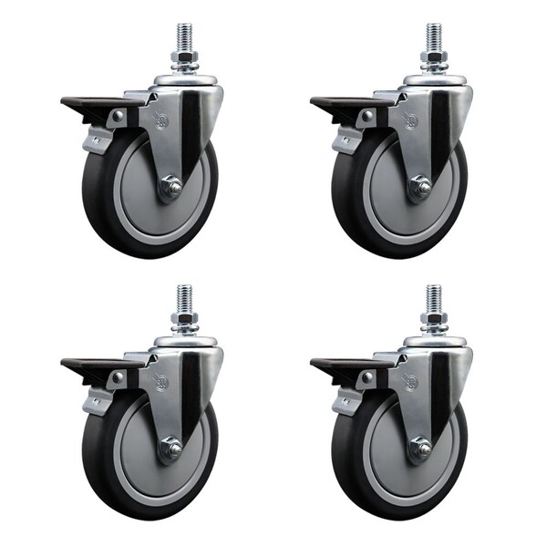 Listing is for a set of four 4 Service Caster Series 20 swivel casters, four 4 swivel 12 threaded stem casters with posi lock brakes, 5 diameter by 114 wide thermoplastic rubber wheels Supports a total weight of 1,200lbs 300lbsper caster When searching for a reliable and durable solution to your caster needs, consider Service Casters 316 stainless steel thermoplastic rubber casters SS316 casters are ideal for light and medium duty material handling, carts, equipment, and shop projects Built withv316 stainless steel, which contains additional molybdenum and nickel content, making it more corrosion resistant than standard 304 stainless steel The soft, quiet and nonmarking thermoplastic rubber wheels perform especially well on hard surfaces such as concrete, tile, and wood They are resistant to water, oil, and grease and will keep you safely moving forward Mounting options include top plate, bolt hole, expanding stem and standard and metric threaded stem sizes