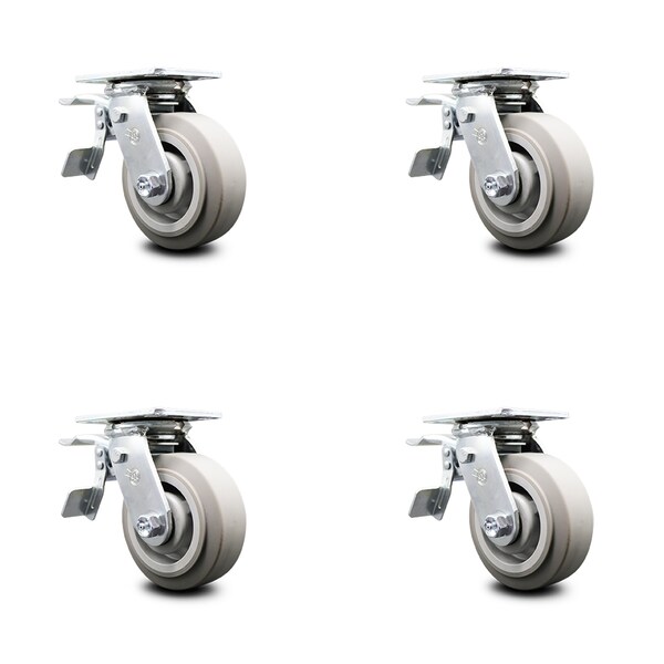 Listing is for a set of four (4) Service Caster Series #30 swivel casters with 5" diameter by 2" wide thermoplastic rubber flat tread wheels with total lock brakes capable of supporting a total weight of 1,400 lbs. (350 lbs. per caster). When searching for a reliable and durable solution for medium and heavy duty projects, consider Service Caster’s Series 30 top plate thermoplastic rubber flat tread on polyolefin core casters. The soft flat tread is made of thermoplastic rubber that is non-marking and non-marring, and on the polyolefin core provides a long lasting, high capacity wheel that is capable of easy rolling under heavy loads. Finely crafted with double ball bearing heat treated raceways, these versatile casters are ideal for a wide range of applications, such as dollies, platform trucks, warehouse carts and freight terminals. Or ensure a smooth and secure ride for food service carts, hotel housekeeping carts, and industrial and commercial equipment. Even drywall carts, welding carts, and wall panel carts will be ready to roll on the Series 30, keeping you moving forward. Service Caster is unsurpassed in quality, reliability, and excellent customer service. Count on us to move you forward.