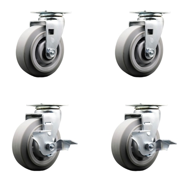 5 Inch Thermoplastic Rubber Swivel Caster Set with Roller Bearings 2 Brakes