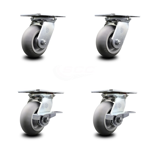 5 Inch Thermoplastic Rubber Swivel Caster Set with Roller Bearings 2 Brakes SCC