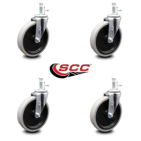 5 Inch Thermoplastic Rubber Wheel 12mm Threaded Stem Caster SCC, 4PK
