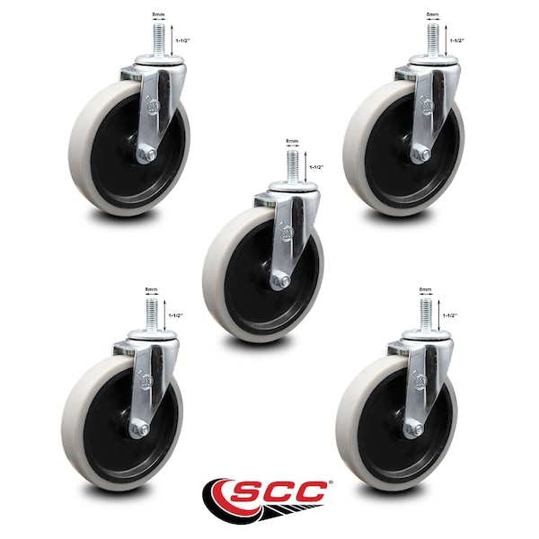 5 Inch Thermoplastic Rubber Wheel 8mm Threaded Stem Caster SCC, 5PK